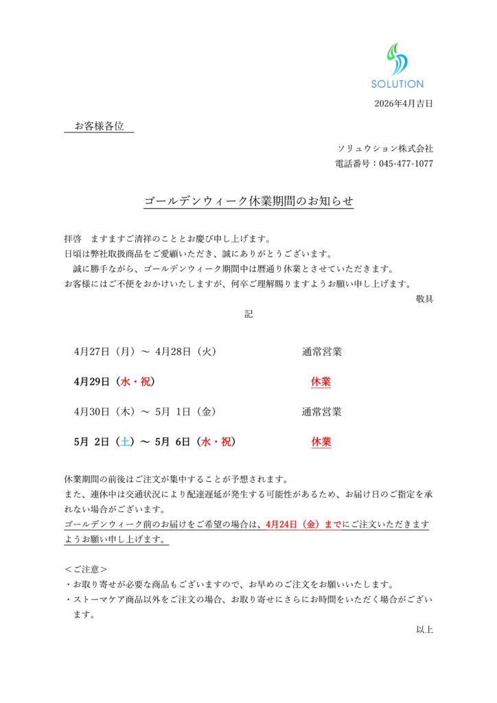 • 2026年ゴールデンウイーク休業期間のお知らせ